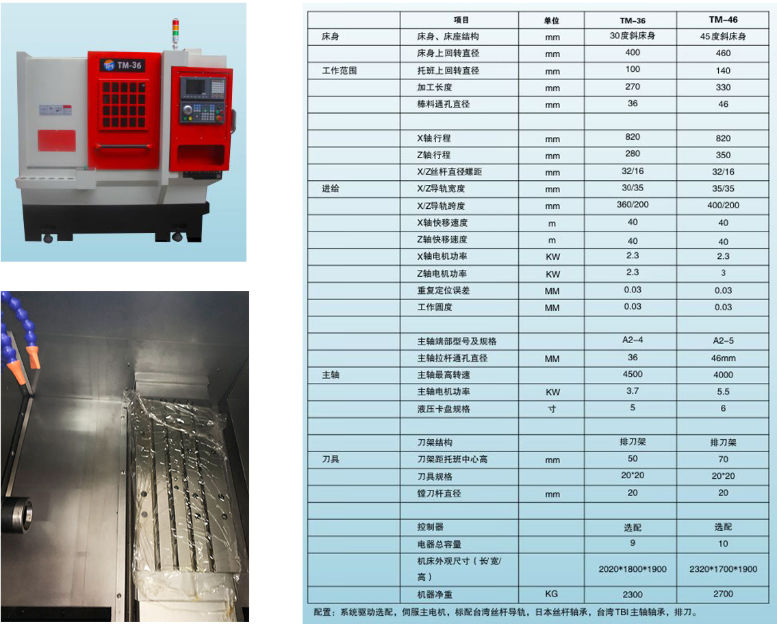 TM36/46車床是一種高精度,高性價比、高速的數控車床,適合完成精度較高、大批量的零件加工,該機床采用整體鑄鐵床身結構,床身傾斜45度。排宵順暢,精度穩定可靠,套筒式主軸結構,抗震性能好,轉速高,機床采用排刀式結構,定位準確,換刀快,G0速度可達40米/秒。外觀設計新穎,面板使用方便,內外全防護,做到滴水不漏。該機床適合小盤類,短軸類精加工和粗加工。可以配備自動送料器、自動接料器、自動排霄器、自動防護門等多鐘附加設施組成柔性加工生產線,以完成零件的自動化加工。